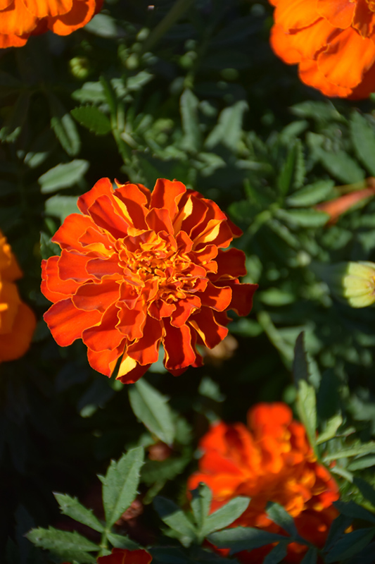 Alumia Red Marigold will grow to be about 12 inches tall at maturity, with a spread of 12 inches. When grown in masses or used as a bedding plant, individual plants should be spaced approximately 10 inches apart. Its foliage tends to remain dense right to the ground, not requiring facer plants in front. This fast-growing annual will normally live for one full growing season, needing replacement the following year.