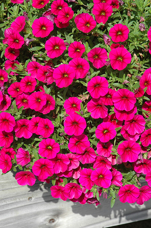 Celebration Purple Rain Calibrachoa is covered in stunning fuchsia trumpet-shaped flowers at the ends of the stems from late spring to early fall. Its small pointy leaves remain green in colour throughout the season.