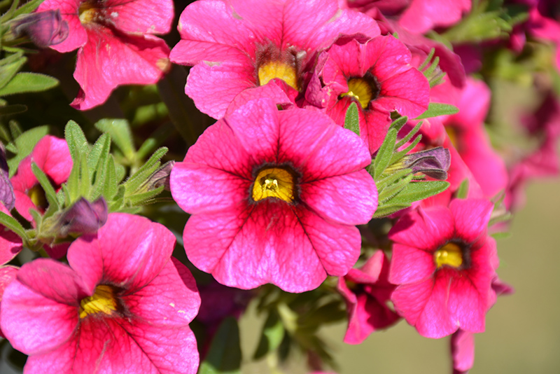 Lindura Neon Calibrachoa is covered in stunning hot pink trumpet-shaped flowers with yellow throats at the ends of the stems from late spring to early fall. Its small pointy leaves remain green in colour throughout the season.