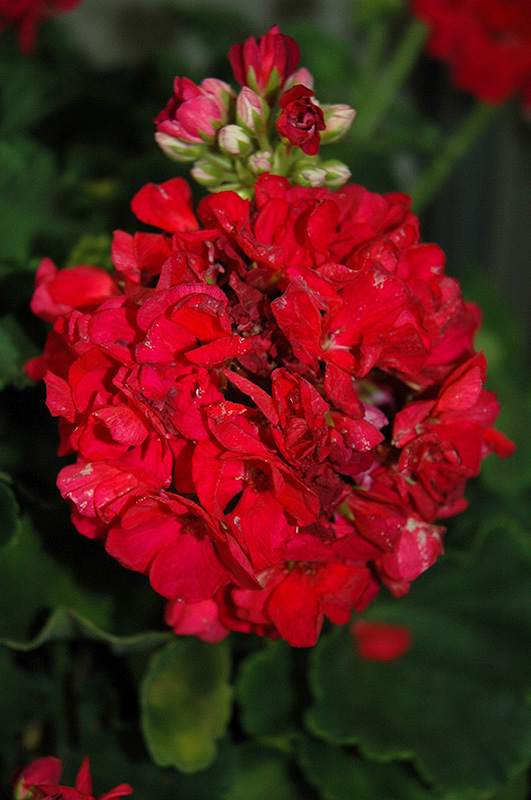 Patriot Cherry Rose Geranium features bold balls of lightly-scented rose flowers with cherry red overtones at the ends of the stems from late spring to early fall. The flowers are excellent for cutting. Its tomentose round palmate leaves remain green in colour with prominent brown stripes throughout the year.