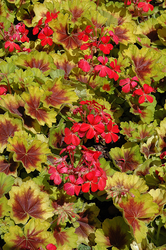 Indian Dunes Geranium features bold balls of lightly-scented red flowers at the ends of the stems from late spring to early fall. The flowers are excellent for cutting. Its tomentose round palmate leaves remain chartreuse in colour with showy coppery-bronze variegation throughout the year.