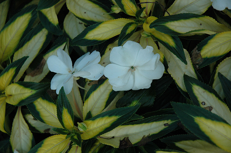 Strike™ White New Guinea Impatiens features bold white round flowers at the ends of the stems from mid spring to early fall. Its pointy leaves remain dark green in colour with showy yellow variegation throughout the season.