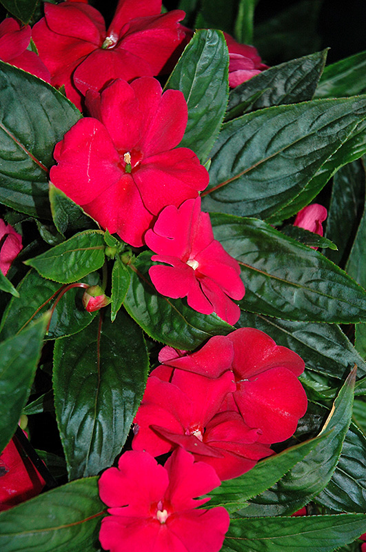 Tamarinda Max Burgundy New Guinea Impatiens features bold burgundy round flowers at the ends of the stems from mid spring to early fall. Its pointy leaves remain dark green in colour throughout the season.