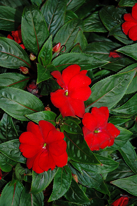Tamarinda Max Red New Guinea Impatiens features bold red round flowers at the ends of the stems from mid spring to early fall. Its pointy leaves remain dark green in colour throughout the season.