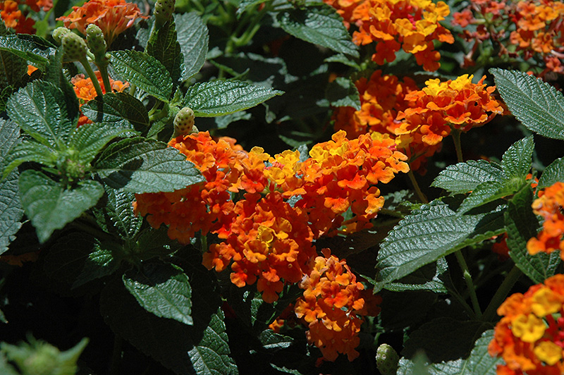 South Beach™ Compact Mango Lantana features showy cymes of orange flowers with gold overtones at the ends of the branches from early summer to mid fall. Its tomentose pointy leaves remain green in colour throughout the year.