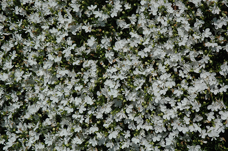 Sunbelia Compact White Lobelia will grow to be about 10 inches tall at maturity, with a spread of 10 inches. When grown in masses or used as a bedding plant, individual plants should be spaced approximately 8 inches apart. Its foliage tends to remain low and dense right to the ground. Although it's not a true annual, this fast-growing plant can be expected to behave as an annual in our climate if left outdoors over the winter, usually needing replacement the following year. As such, gardeners should take into consideration that it will perform differently than it would in its native habitat.