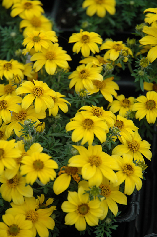 Bidy Gonzales Bidens has masses of beautiful yellow daisy flowers at the ends of the stems from late spring to mid fall, which are most effective when planted in groupings. Its tiny deeply cut ferny leaves remain green in colour throughout the season.