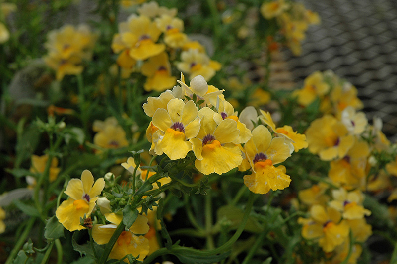 Juicy Fruits Papaya Nemesia features dainty spikes of lightly-scented gold pea-like flowers with purple eyes and orange centers at the ends of the stems from late spring to late summer. Its small pointy leaves remain green in colour throughout the season.