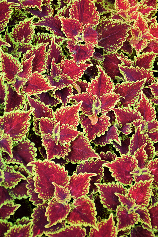 Oxford Street Coleus' attractive serrated pointy leaves remain cherry red in colour with distinctive lime green edges and tinges of dark red throughout the year on a plant with an upright spreading habit of growth.
