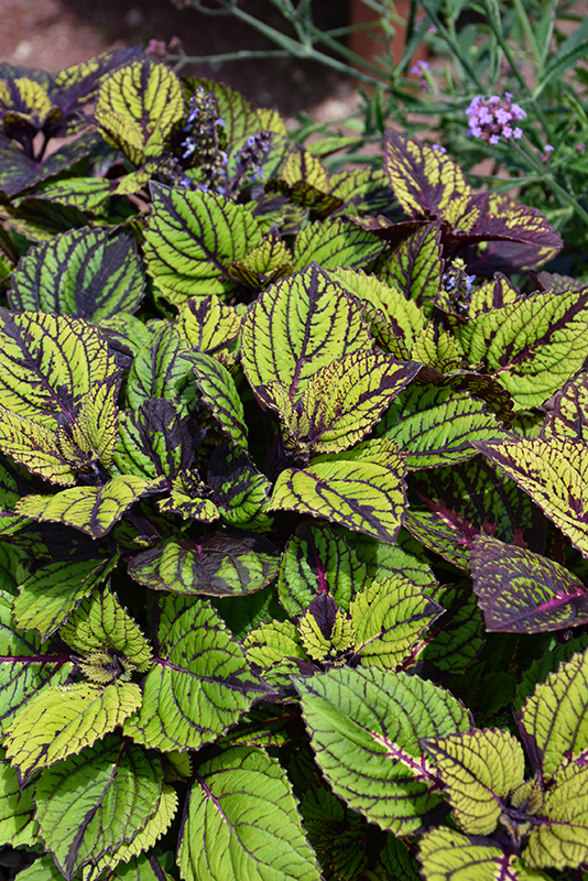 Fishnet Stockings Coleus' attractive serrated pointy leaves remain chartreuse in colour with distinctive deep purple veins throughout the year on a plant with an upright spreading habit of growth.