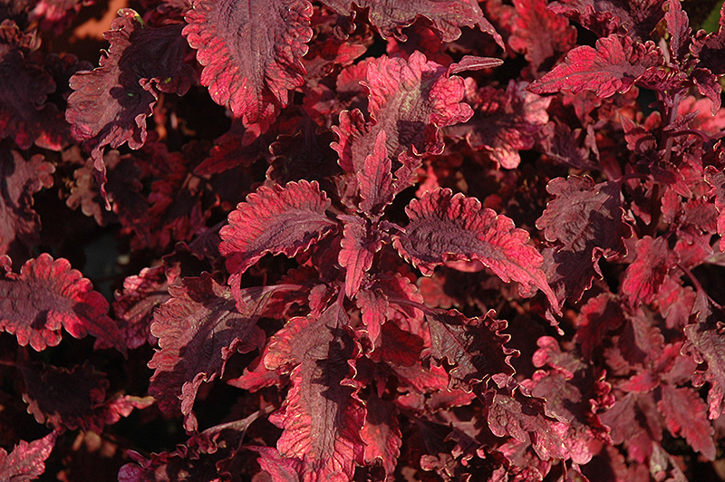 Mississippi Summer Coleus' attractive serrated pointy leaves remain red in colour with showy brown variegation throughout the year on a plant with an upright spreading habit of growth.