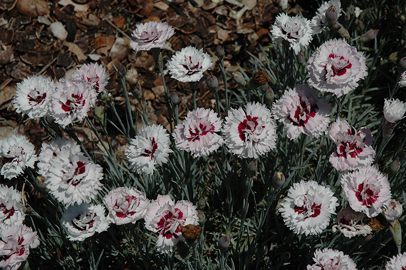 Amazing double flowers are pure white with contrasting deep crimson centers, covering mounds of fine blue-green foliage; great for flower arrangements; deadhead to promote re-blooming; a stunning display for border fronts and containers