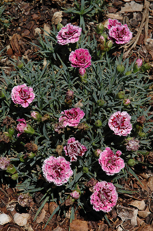 SuperTrouper™ Velvet White Carnation has masses of beautiful fragrant double pink frilly flowers with burgundy eyes and white edges at the ends of the stems from late spring to mid fall, which are most effective when planted in groupings. The flowers are excellent for cutting. Its attractive narrow leaves remain grayish green in colour throughout the year.