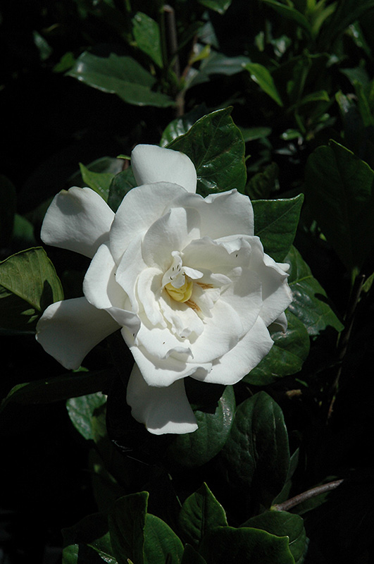 Whispering Pines Gardenia features showy fragrant double white flowers with buttery yellow eyes at the ends of the branches from early to late summer. The flowers are excellent for cutting. It has dark green evergreen foliage. The glossy pointy leaves remain dark green throughout the winter.
