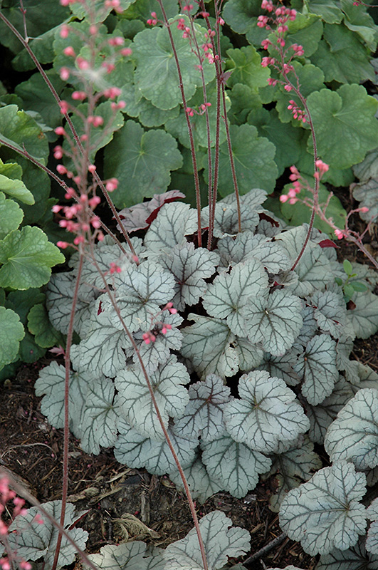 Silver Blush Coral Bells will grow to be about 10 inches tall at maturity extending to 18 inches tall with the flowers, with a spread of 14 inches. When grown in masses or used as a bedding plant, individual plants should be spaced approximately 12 inches apart. Its foliage tends to remain low and dense right to the ground. It grows at a medium rate, and under ideal conditions can be expected to live for approximately 10 years. As an evegreen perennial, this plant will typically keep its form and foliage year-round.