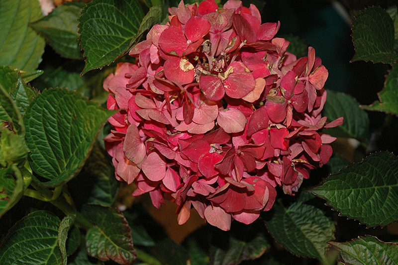 Electric Rouge Hydrangea features bold balls of red flowers with pink overtones at the ends of the branches from early summer to early fall. The flowers are excellent for cutting. It has forest green deciduous foliage. The glossy pointy leaves do not develop any appreciable fall colour.