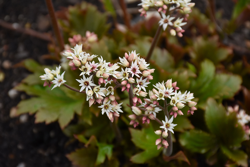 A woodland treasure that forms a low round mound of large maple like leaves that mature to deep green with stunning crimson tips; lovely spikes of dainty white flowers tower above the mounded foliage in spring; excellent for containers or edging