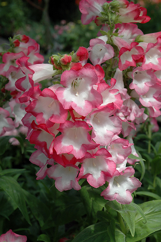 An impressive penstemon producing white trumpet flowers with stunning coral pink tips, rising above green foliage; makes a beautiful visual impact when massed in the garden, along walkways, or in borders