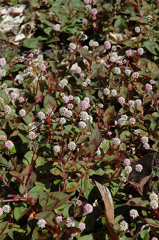 Magic Carpet Knotweed's attractive pointy leaves remain grayish green in colour with prominent burgundy stripes throughout the season on a plant with a spreading habit of growth. It has masses of beautiful white button flowers rising above the foliage from late summer to mid fall, which emerge from distinctive pink flower buds, and which are most effective when planted in groupings. The flowers are excellent for cutting.