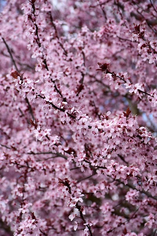Mt. St. Helens Plum is blanketed in stunning clusters of fragrant pink flowers along the branches in early spring before the leaves. It has attractive deep purple deciduous foliage. The pointy leaves are highly ornamental and turn an outstanding burgundy in the fall. The fruits are showy purple drupes displayed in mid summer.