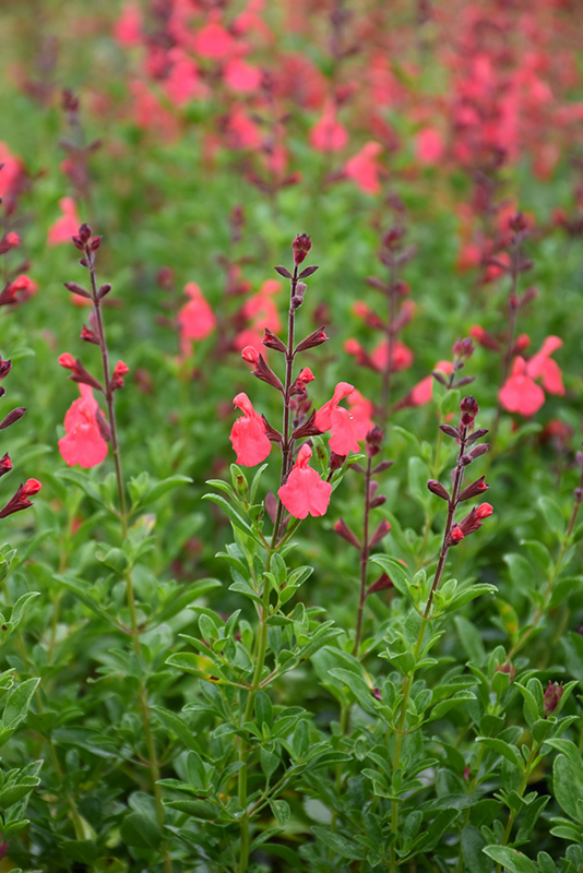 Coral Autumn Sage has masses of beautiful racemes of coral-pink flowers rising above the foliage from mid summer to mid fall, which emerge from distinctive burgundy flower buds, and which are most effective when planted in groupings. The flowers are excellent for cutting. Its fragrant narrow leaves remain green in colour throughout the year. The burgundy stems can be quite attractive.