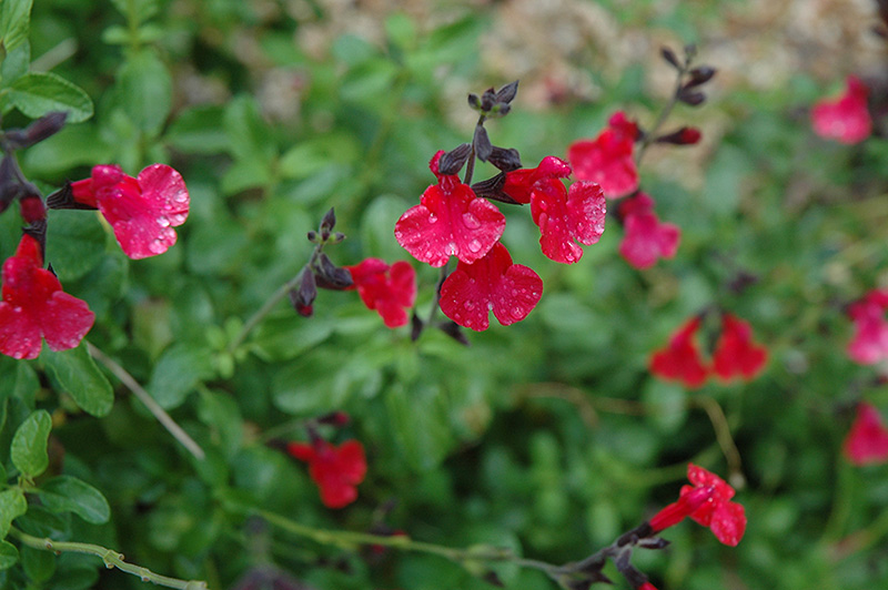 Navajo Red Autumn Sage has masses of beautiful racemes of lightly-scented red flowers rising above the foliage from late spring to mid fall, which emerge from distinctive black flower buds, and which are most effective when planted in groupings. The flowers are excellent for cutting. Its fragrant narrow leaves remain green in colour throughout the year.