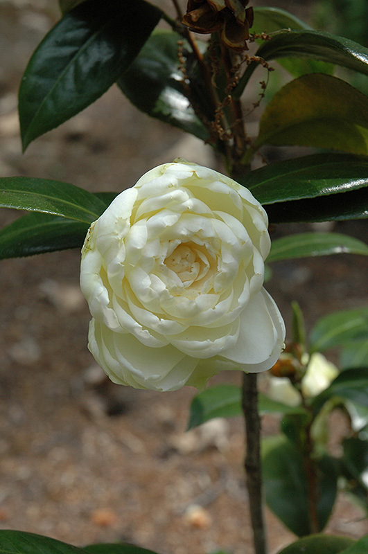 Dahlonega Camellia features showy double buttery yellow round flowers with creamy white overtones at the ends of the branches from early to mid spring. It has dark green evergreen foliage. The glossy pointy leaves remain dark green throughout the winter.
