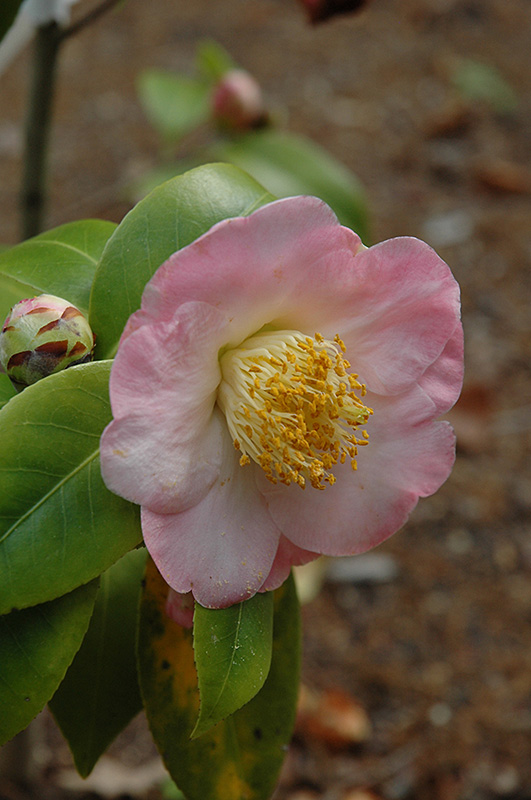 Peter Pan Camellia features showy semi-double creamy white round flowers with shell pink overtones, gold eyes and hot pink edges at the ends of the branches from early to mid spring. It has dark green evergreen foliage. The glossy pointy leaves remain dark green throughout the winter.