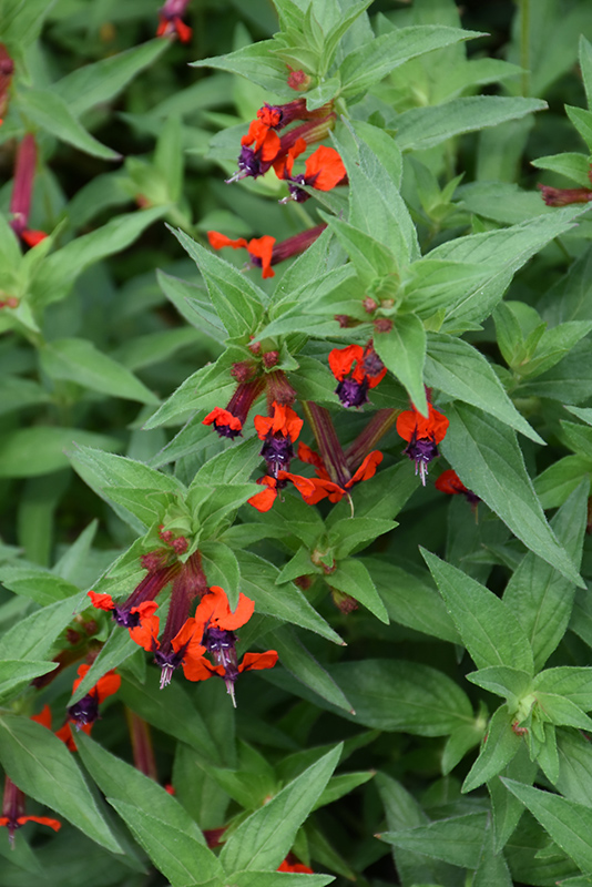 Small, freely branching shrub or subshrub with unusual tubular flowers lipped with upward facing red petals and purple eyes with dark red flutes; great for bedding, shrub borders, and containers in warm climates