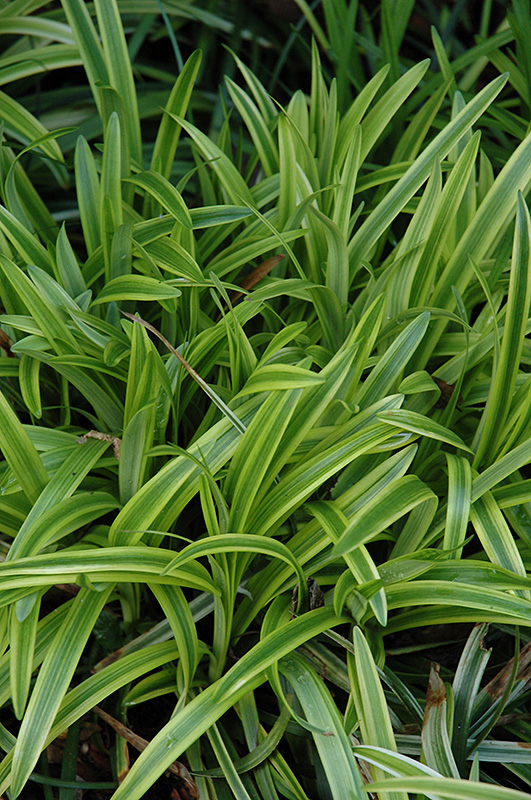 A tufted grass like variety that features a clump of arching, glossy, bright green leaves with yellow edges; a beautiful display of lovely lavender pink flower spikes; it is best as an edging plant or massed as a groundcover; less variegation in shade