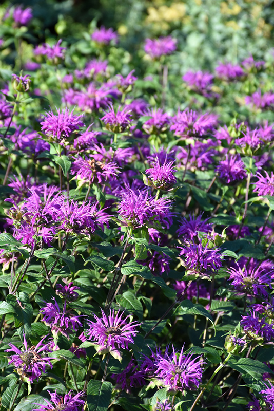 A dense, upright form of bee balm that produces whorls of striking violet-purple flowers over a long period; this variety is mildew resistant as well; great for massing in the middle of borders