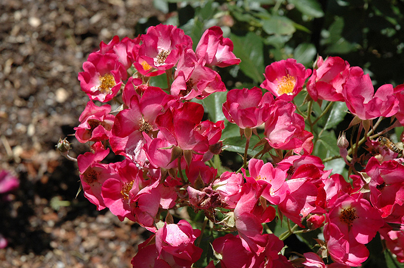 Miracle Sensation Rose is bathed in stunning clusters of fragrant pink flowers with gold eyes and a white ring at the ends of the branches from mid spring to mid fall. The flowers are excellent for cutting. It has dark green deciduous foliage. The glossy oval compound leaves do not develop any appreciable fall colour.