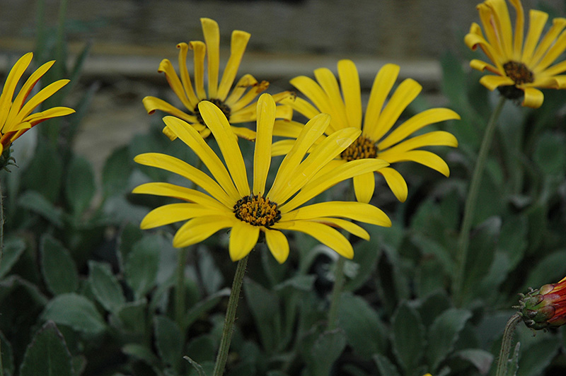 The Ravers Bumble Bee African Daisy features showy yellow daisy flowers with gold eyes and black centers at the ends of the stems from mid fall to late spring. The flowers are excellent for cutting. Its tomentose pointy leaves remain grayish green in colour throughout the season.