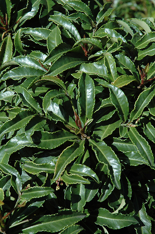 Japanese Holly features dainty clusters of pink bell-shaped flowers with white overtones at the ends of the branches in mid spring. It features an abundance of magnificent red berries in mid fall. It has dark green evergreen foliage. The glossy narrow leaves remain dark green throughout the winter.
