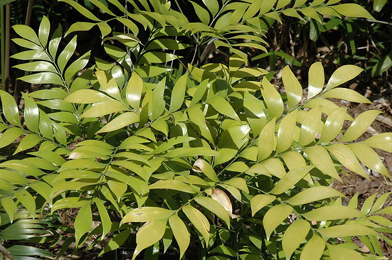Zamia Fern has attractive dark green evergreen foliage which emerges chartreuse in spring on a plant with an arching habit of growth. The glossy pointy bipinnately compound leaves are highly ornamental and remain dark green throughout the winter. It features subtle spikes of creamy white flowers with green overtones rising above the foliage in mid summer. The green fruits are held in cones in late summer.