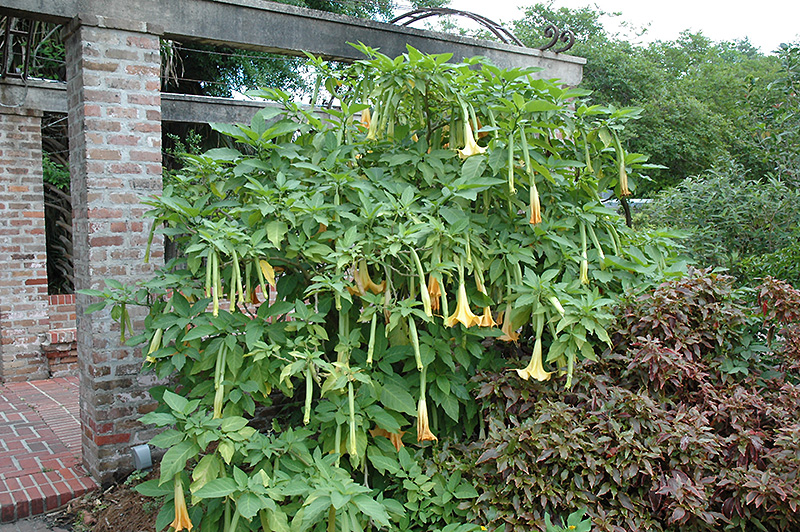 Golden Angel's Trumpet will grow to be about 15 feet tall at maturity, with a spread of 8 feet. It has a low canopy with a typical clearance of 2 feet from the ground. Although it's not a true annual, this fast-growing plant can be expected to behave as an annual in our climate if left outdoors over the winter, usually needing replacement the following year. As such, gardeners should take into consideration that it will perform differently than it would in its native habitat.