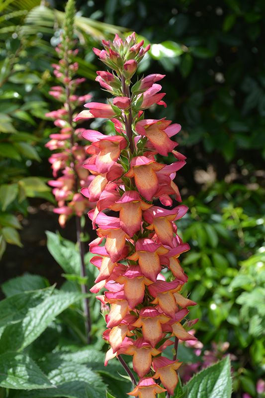 Illumination® Flame Tender Foxglove features bold spikes of fuchsia tubular flowers with orange overtones, buttery yellow throats and red streaks rising above the foliage from early to late summer. The flowers are excellent for cutting. Its pointy leaves remain green in colour with showy purple variegation throughout the season. The brick red stems can be quite attractive.