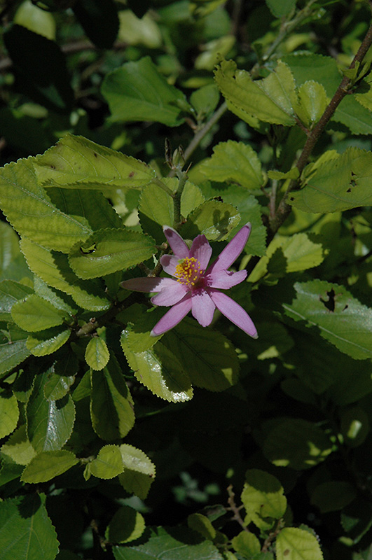 Lavender Star Flower features showy double lavender star-shaped flowers with gold eyes along the branches from early spring to late fall. It has dark green evergreen foliage which emerges chartreuse in spring. The serrated oval leaves remain dark green throughout the winter.