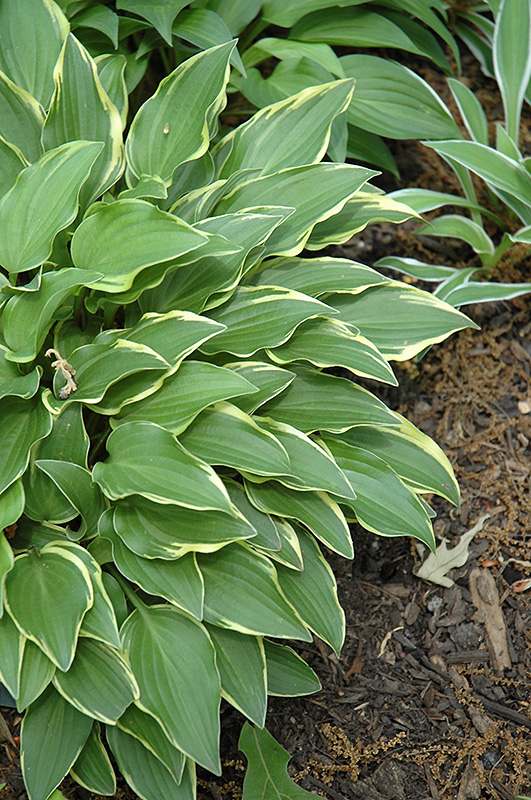 An outstanding miniature hosta with dark green, narrowly ovate leaves with a wide cream to white margin; purple flowers on dark scapes in summer; perfect for shade and woodland gardens