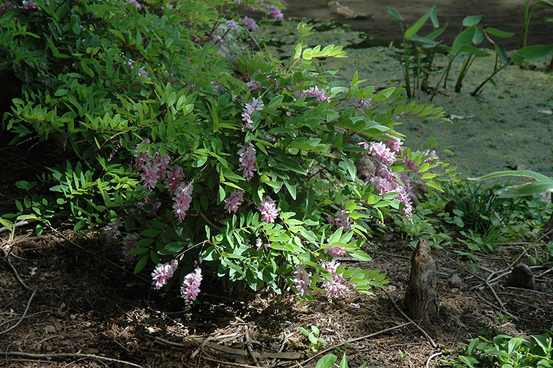 Gracefully arching racemes of white and rose-pink pea-shaped flowers make a showy display in the middle of summer; compound foliage adds a nice texture to the landscape; will die back to the ground in colder climates, but will resprout from the roots