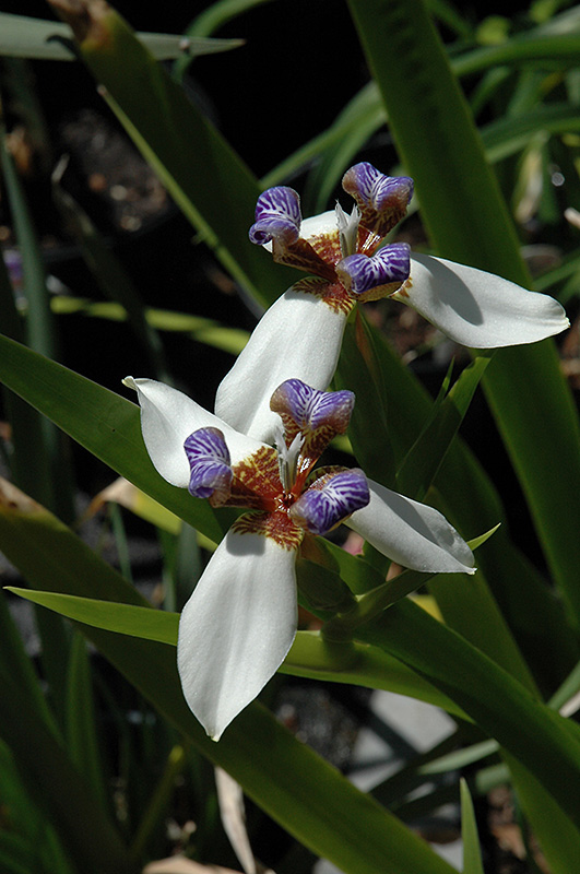 Walking Iris has spikes of fragrant white orchid-like flowers with burgundy throats and blue stripes rising above the foliage from mid spring to mid fall, which are interesting on close inspection. The flowers are excellent for cutting. Its sword-like leaves remain dark green in colour throughout the season.