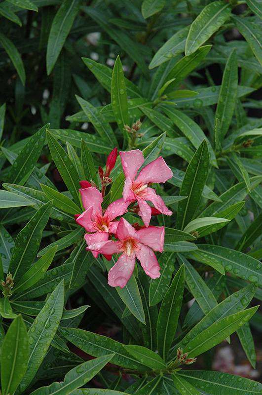 Turner's Trey Boy™ Oleander features showy clusters of pink star-shaped flowers with yellow eyes and hot pink stripes at the ends of the branches from late spring to early fall, which emerge from distinctive red flower buds. Its narrow leaves remain green in colour throughout the year.