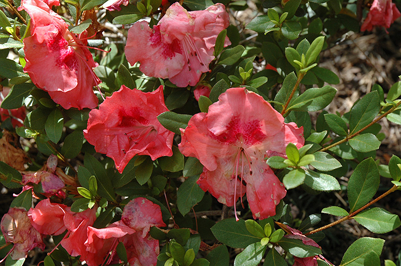 An evergreen variety that bears large shell pink blooms with purple-red blotches in mid-spring; absolutely must have well-drained, highly acidic and organic soil, use plenty of peat moss when planting