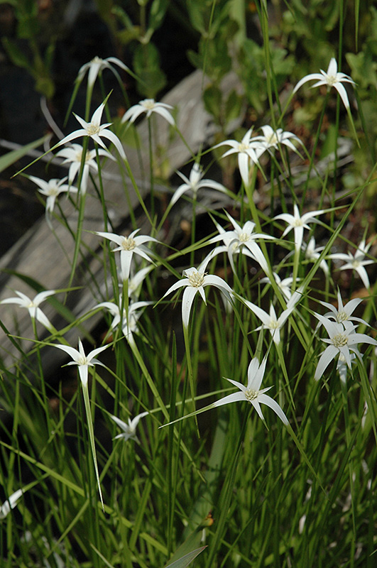 Star Rush features showy white star-shaped flowers at the ends of the stems from late spring to mid summer. The "flowers" are actually comprised of a showy ring of coloured bracts (modified leaf structures) surrounding the true creamy white inflorescence in the center. Its grassy leaves remain green in colour throughout the season.