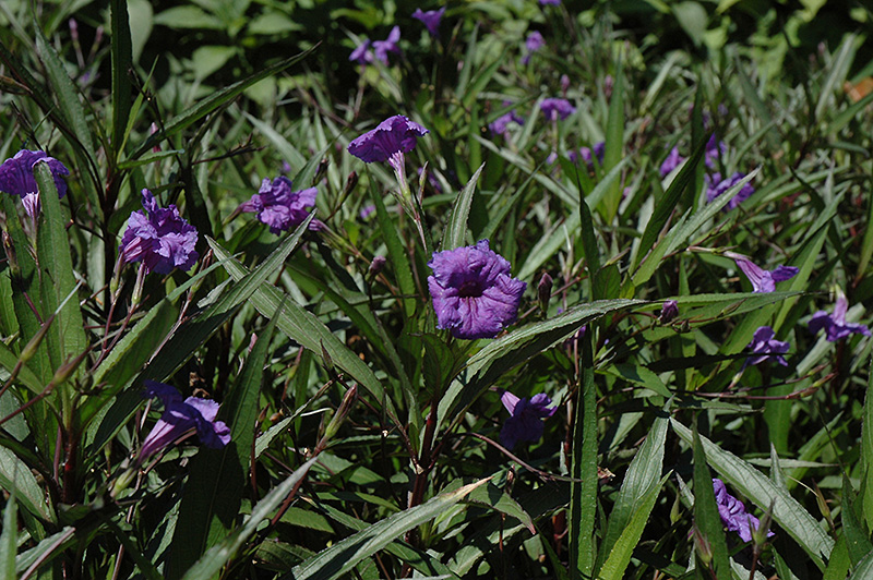 Purple Showers Mexican Petunia will grow to be about 4 feet tall at maturity, with a spread of 3 feet. When grown in masses or used as a bedding plant, individual plants should be spaced approximately 24 inches apart. Although it's not a true annual, this fast-growing plant can be expected to behave as an annual in our climate if left outdoors over the winter, usually needing replacement the following year. As such, gardeners should take into consideration that it will perform differently than it would in its native habitat.