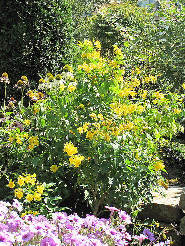 A heat loving, full sun, compact shrub with a tropical appearance, producing clusters of showy, bright yellow trumpet flowers all season long; a stunning landscape or garden accent