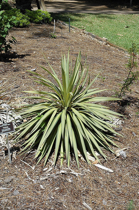 This exceptional variety is a succulent cactus-like shrub with yellow variegated spear-like leaves radiating from the center and tall spikes of nodding ivory flowers in summer; good for dry sites, use in containers or as a border accent