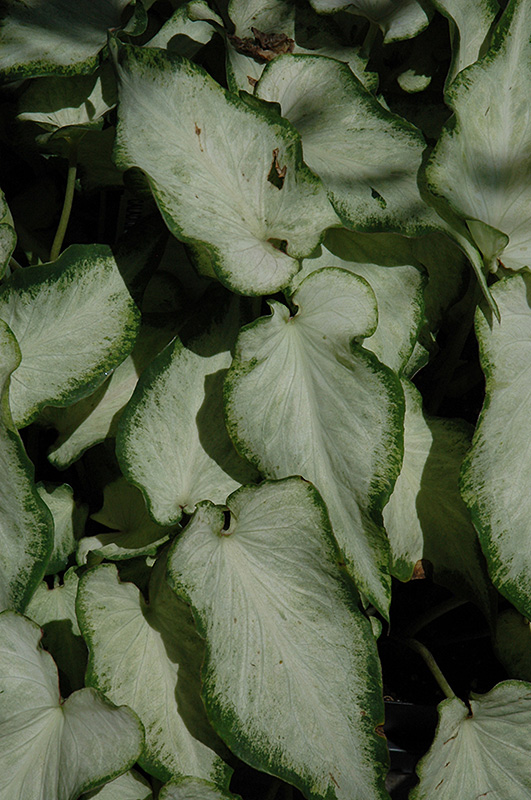White Pearl Caladium's attractive pointy leaves remain white in colour with distinctive dark green edges throughout the season on a plant with a mounded habit of growth.