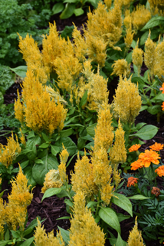 Large, brightly colored summer plumes of sunny yellow-gold, set against the green foliage on dense compact plants; an impressive display when massed in the garden or along borders; a great container plant as well