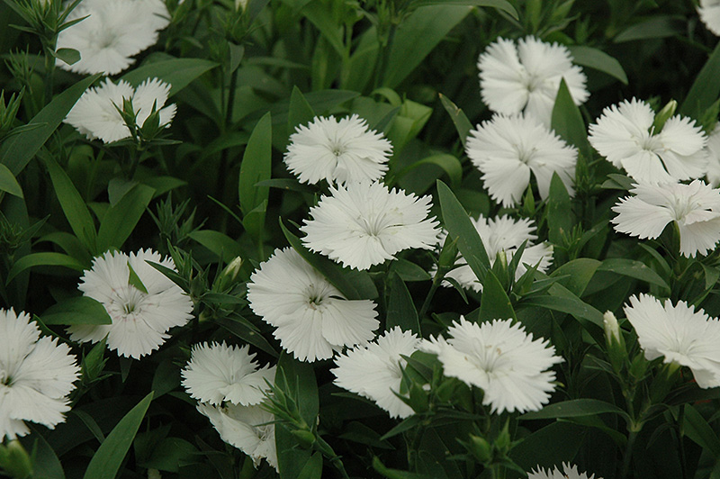 Elation White Pinks will grow to be only 6 inches tall at maturity extending to 12 inches tall with the flowers, with a spread of 12 inches. When grown in masses or used as a bedding plant, individual plants should be spaced approximately 8 inches apart. Its foliage tends to remain low and dense right to the ground. It grows at a medium rate, and under ideal conditions can be expected to live for approximately 10 years. As an evegreen perennial, this plant will typically keep its form and foliage year-round.
